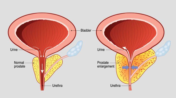 In men, urine flows from the bladder through the urethra. BPH is a benign (noncancerous) enlargement of the prostate that blocks the flow of urine through the urethra. The prostate cells gradually multiply, creating an enlargement that puts pressure on the urethra — the “chute” through which urine and semen exit the body.